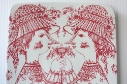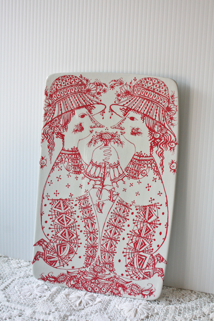 デンマークで人気のアーティスト/Bjorn Wiinblad(ヴョルン・ウィンブラッド)の美しい絵皿です。こちらは野原でヒマワリを摘みながら鏡のように向かい合わせに双子の女性が描かれています。スクエアフォルムでテーブルを華やかにコーディネートしたり、裏面には穴も開いていますので壁掛けとして飾っても素敵です。市場でもなかなか見かけない当店初入荷の作品ですのでコレクションにいかがでしょうか。
