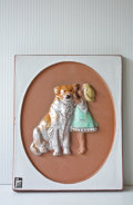 スウェーデンのjie gantofta社製の陶器の壁掛けです。こちらは大きなワンちゃんと可愛らしいおしゃまな女の子が内緒話をしている様子がデザインされています。眺めているだけでも温かい気持ちになるほっこりとしたモチーフが素敵です。