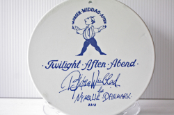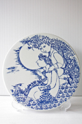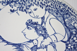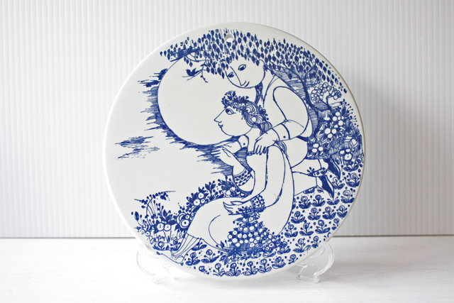 デンマークで人気のアーティスト/Bjorn Wiinblad(ヴョルン・ウィンブラッド)の美しい絵皿です。こちらは日の出を親子3人で見ている幸せなデザインです。マリンブルーの落ち着いたカラーで繊細なタッチが描かれています。