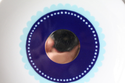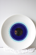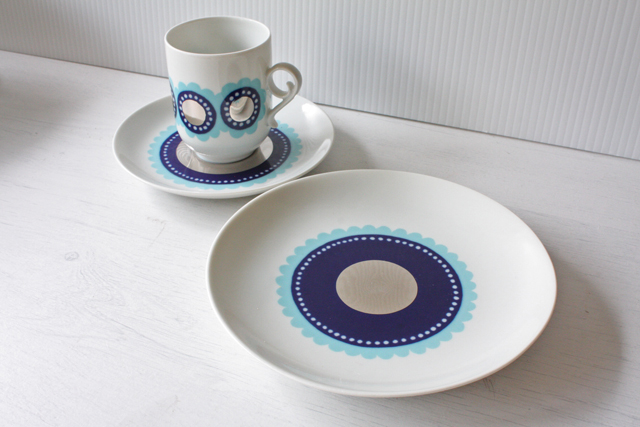 フィンランド、ARABIA/Tanjaのケーキプレートです。アラビア社で活躍したエステリ・トムラがデザインしました。お花の中心にキラキラのまあるいミラーのようなモチーフが並んでおり、個性的なデザインです。ひまわりのようなフラワーモチーフで、飾っても使っても楽しめる素敵なお品ですね。