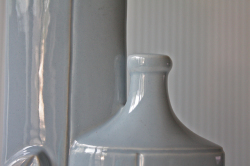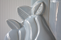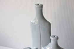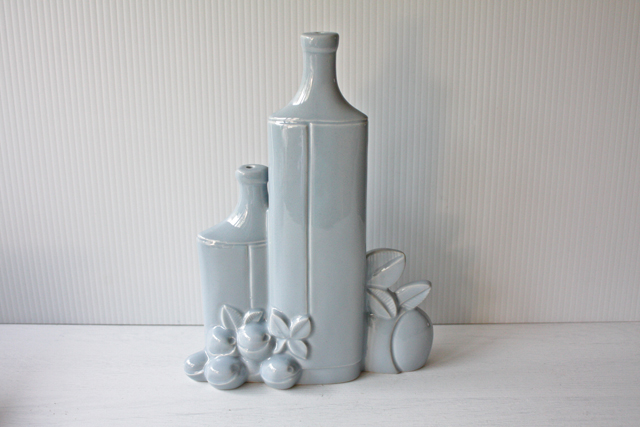 スウェーデンのjie gantofta社製の陶器のオブジェです。こちらはボトルと果物のモチーフを柔らかなアイスブルーのお色で仕上げた可愛らしい雰囲気のものになります。リバーシブルになっており、両面共に違った果物がデザインされています。場所を取らないように奥行きは薄く作られています。そのため、細いスペースにもおいていただきやすくなっています。