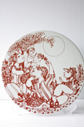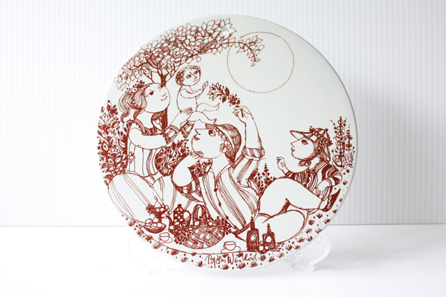 デンマークで人気のアーティスト/Bjorn Wiinblad(ヴョルン・ウィンブラッド)の美しい絵皿です。朝・昼・夜の場面がデザインされた3部作です。こちらは赤ちゃんを含んだ家族4人でピクニックを楽しんでいます。ブラウンカラーの落ち着いたカラーで繊細なタッチが描かれています。