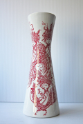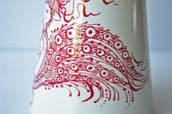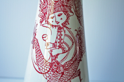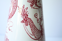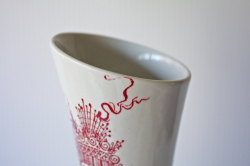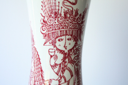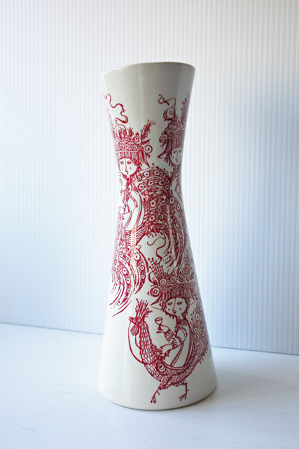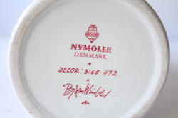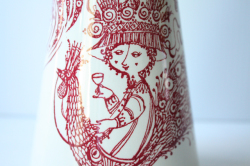 デンマークで人気のアーティスト/Bjorn Wiinblad(ヴョルン・ウィンブラッド)のフラワーベースです。こちらはシャープでスマートなフォルムのベースで、可愛らしい女性が孔雀に乗りながらワインを楽しんでいる様子が描かれています。二モール社の製品は数が少なく、こちらのデザインも当店初入荷になります。可愛らしくて愛嬌のあるタッチで描かれており、ほっこりとした印象です。
