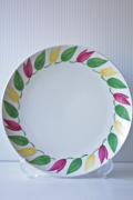 スウェーデン、Upsala Ekeby社のケーキプレートです。こちらはDUKATシリーズで、縁周りにレッド、イエロー、グリーンのフラワーモチーフがハンドペイントで描かれ、ヴィンテージらしい素朴なデザインのプレートです。お菓子が華やかに盛りつけられてほっこりとしたティータイムを楽しんでいただけそうです。