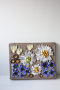 スウェーデンのjie gantofta社製の陶器の壁掛けです。Jieの陶板は可憐なお花がデザインされているものが多く、可愛らしいものからシックなものまでお気に入りを見つけてください。こちらは素朴な素焼きの地にいろんな種類の花々がデザインされた豪華な陶板です。複数枚、組み合わせて飾るのも素敵です。裏面には、壁に掛ける穴が開いています。