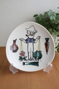 1960年代にFiggoと合併したノルウェーのStavangerflint(スタヴァンゲルフフリント)社の壁掛けプレートです。どこかキュートな農夫のおじさんと玉ねぎ、ニンジン、キャベツ、ポロねぎとお花がデザインされています。プリントされた図柄に手彩色でささっと色がつけられていて素朴な味わいがあります。裏面に壁掛け用の穴が開いています。