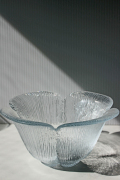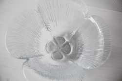 デンマークの王室御用達ブランド、Holmegaardのガラスボウルです。こちらはクローバーのようなお花のモチーフになっていて、花びらが1枚1枚立体的に表現されています。どっしりと重量感もあり、華やかです。写真の左側の器になります。