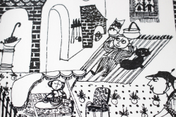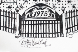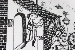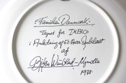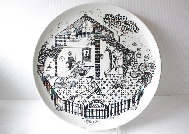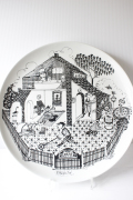 デンマークで人気のアーティスト/Bjorn Wiinblad(ヴョルン・ウィンブラッド)がImerco社のためにデザインしたプレートです。Bjorn Wiinblad 生誕60年アニバーサリー と裏面に記載があります。デンマークの家族がモチーフとなっています。お風呂に入っている女性、キッチンで料理をする女性、庭でバーベキューの準備や芝刈りをする男性などそれぞれが楽しげでほのぼのとしています。大きなサイズで絵画のように飾っていただくとよいでしょう。裏面には、壁に掛けるための穴があります。