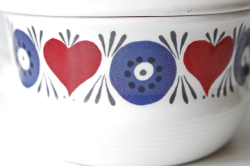 スウェーデン、Rorstrand(ロールストランド)のSiljaシリーズのミニサイズのキャセロールです。落ち着いたローズピンク、ブルーがかったパープル、ライトグレーの絶妙な配色とハート、ドットなど可愛らしいモチーフがデザインされた北欧らしい素敵なデザインです。耳付きの可愛らしいフォルムですので、キャンディなどのおやつやピクルスなどのおかずをサービングして食卓で楽しんで下さい。