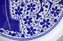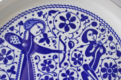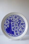 スウェーデン、GUSTAVSBERG(グスタフスベリ)のBAGSKYTTシリーズのサービングプレートです。スウェーデン語で「射手」という意味で、矢を放つ女性、首に矢を射られた男性がデザインされています。どこか物語の一場面のようで飾っても実用でも楽しめる素敵なプレートです。デザイナーは、今も芸術活動を続けるBengt Berglundで1971~1972年の2年間だけ作られた希少なお品です。裏面の刻印にはオーブン利用可能と書かれています。(左側の大きいプレートのご紹介です)