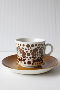 フィンランド、ARABIAのステンシルシリーズのカップ&ソーサーです。模様の型に職人がスプレーで吹き付けるという技法で製作されています。そのため、ふんわりした柔らかな色合いが魅力となっています。ブラウンのお花と水玉が上品な可愛らしさを醸しています。