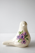 スウェーデン/Rosa Ljungデザインのオブジェです。こちらは小鳥がモチーフになっていて中央には、Rosa Ljungの得意なお花がデザインされており可愛らしい雰囲気です。こちらはホワイトカラーにパープルのお花がデザインされている小鳥です。