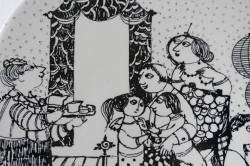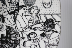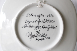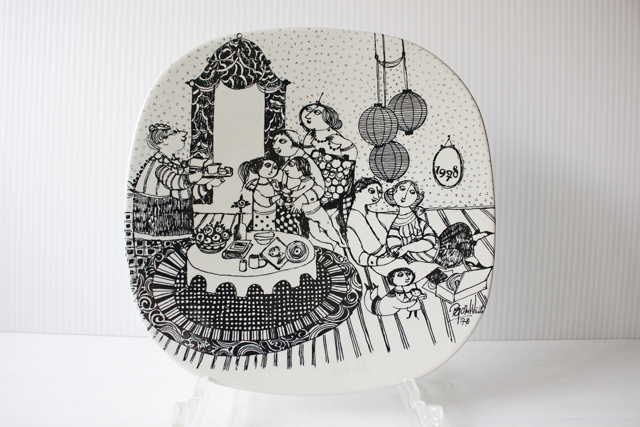 1978年に創業50周年を迎えた生活用品を扱うデンマークのIMERCO社のためにヴィヨルンがデザインした飾り皿です。創業の年1928年当時と50年後の1978の生活の様子が描かれたシリーズです。同じ家の中の様子ですが、服装や人々の様子が全く違っていて時を感じさせる面白いデザインです。今回入荷は1978年の家族の様子。3世代で幸せ一杯に寛ぐ家族が描かれており、とても和む絵柄です。