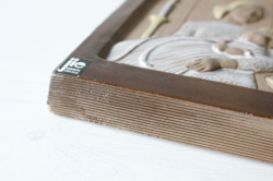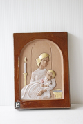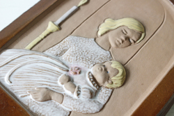 スウェーデンのjie gantofta社製の陶器の壁掛けです。こちらはスウェーデン人のお母さんと赤ちゃんがデザインされています。協会にて洗礼式を受けている様子が描かれています。安らかで、穏やかな時間が感じ取られ、ほっこりとするモチーフですね。複数枚、組み合わせて飾るのも素敵です。裏面には、壁に掛ける穴が開いています。