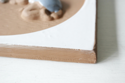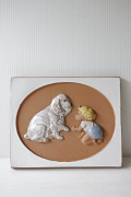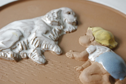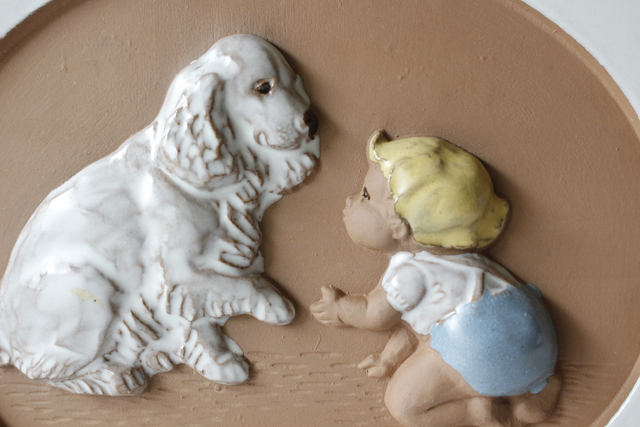 スウェーデンのjie gantofta社製の陶器の壁掛けです。こちらはハイハイしている北欧のあかちゃんが大きな白い犬と向かい合い、わんちゃんはお手をするポーズをとっています。大きな犬でも部屋飼いが基本の文化ですので、ワンちゃんも慣れた様子で優しく赤ちゃんを見守っています。ほっこりするデザインですね。複数枚、組み合わせて飾るのも素敵です。裏面には、壁に掛ける穴が開いています。