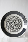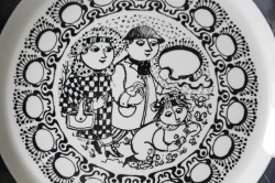 デンマークの人気デザイナーBjorn Wiinblad(ヴョルン・ウィンブラッド)のプレートです。このシリーズは、1月から12月までのシリーズで合計12種類の図柄があります。こちらは3月で、小さな子供を連れた家族が描かれています。土遊びをする無邪気な子供とそれを眺める優し気なお父さんとお母さん。お母さんのレトロなファッションや子供の丸襟のお洋服が可愛らしいです。ほっこりした雰囲気の素敵なデザインでお勧めですよ。