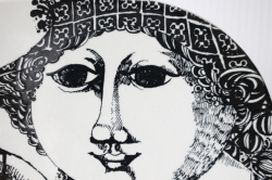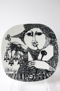 デンマークの人気デザイナーBjorn Wiinblad(ヴョルン・ウィンブラッド)の美しい絵皿です。こちらは、イヤープレートになります。指に1979と4つの鈴を掛けてもう一方の手にはベルを打つスティックを持っています。テーブルの上には78と2つの鈴が置いてあり、新しい年への移行をユニークに表現しています。繊細で細かいペンタッチでモノトーンならではの影や光が美しく表現されています。手の込んだ素敵なデザインでお勧めですよ。