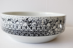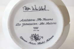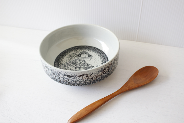 デンマークの人気デザイナーBjorn Wiinblad(ヴョルン・ウィンブラッド)の丸ボウルです。このシリーズは、春夏秋冬の4シリーズで発売されたものです。こちらは秋のボウルで、洋梨の収穫を描いています。腰に付けたエプロンに溢れるほどの洋ナシが集められ、豊作を喜んでいる可愛らしい様子が描かれています。現地でもあまり見かけないフォルムで当店初入荷、使いやすい大きさで大変おススメですよ~。