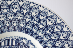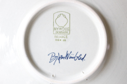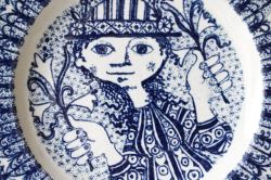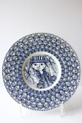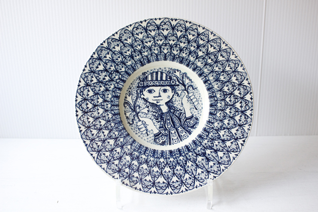 デンマークの人気デザイナーBjorn Wiinblad(ヴョルン・ウィンブラッド)の美しい絵皿です。中央に両手にユリのようなお花を持った女の子が微笑んでいます。女の子を囲むようにして、ユリのお花が緻密に描かれています。単色ながら、ヴィンブラッドならではの華やかさがあります。壁に飾れるようにヒモを通す穴が開いています。