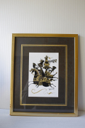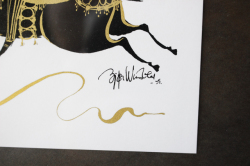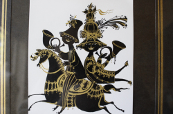 デンマークの国民的人気デザイナーBjorn Wiinblad(ヴョルン・ウィンブラッド)の美しい影絵(イラスト)です。ヴョルンといえば絵皿が有名ですが、イラストレーターとしての作品も素晴らしいのです。こちらは影絵に金彩で表情がつけられています。メリーゴーランドのような華やかな馬に乗ってトランペットを吹いているハッピーな姿が癒されます。