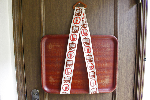 クッキーの応募キャンペーンで製作したトレイハンガー。Pagenの本拠地であるスウェーデン南部スコーネをイメージしたデザインがプリントされています。オレンジとチョコレートブラウンの色使いで、アヒルや灯台の光のようなモチーフが幾何学模様のように並んだデザインです。キッチンに見せる収納はいかがでしょうか。