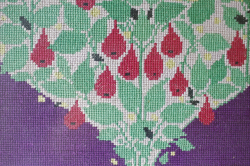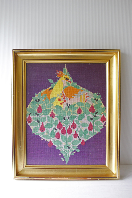 デンマークで見つけた北欧刺繍のフレームです。こちらは、Bjorn Wiinbladデザインの図案で作られています。華やかな色使いながら、背景のバイオレット色が全体を引き締め落ち着いた雰囲気となっています。画面をびっしりと刺繍で覆った手の込んだ作品です。