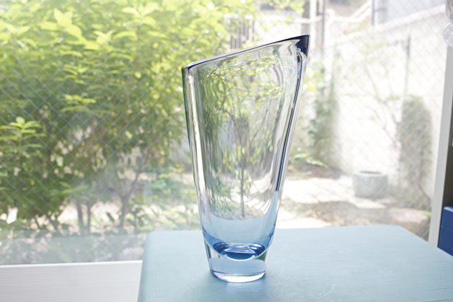 デンマーク、Holmegaard(ホルムゴー)のガラスの花瓶です。シンプルなフォルムで優しいライトブルーのお色なので、どんなお花でも合わせられそうです。間口が広がっているデザインですので、お手入れしやすく、華やかなブーケなどを飾って頂くのにぴったりです。厚みのある滑らかな肌触りは、品質の高さを感じさせます。大きなサイズですので豪華なお花を飾っても映えます。