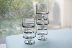 デンマーク、Holmegaard(ホルムガード)のガラスのグラスです。こちらはStubというシリーズで1950年代後半から1990年までの長きに渡り作られていたベストセラーです。美しいフォルムにスタッキングできるところから、収納もバランスよく出来るため、とても実用的です。こちらは小さなスナップス用のグラスになりますが、四角の脚付きフォルムですので、日本酒や、豆皿のように梅干しなどを一つ入れて食卓に出してもステキです。時を経て2019年には一部のサイズが復刻されていますが、こちらの小さいサイズはヴィンテージのみになります。当時の作品は一つ一つのガラスの厚みなども違い、味わい深いのもおススメです。