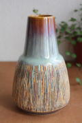 デンマークの小さな島(ボーンホルム島)に1835年から1996年まで存在した名窯Soholm(スーホルム)のフラワーベースです。淡いブラウンとペールブルーのようなペールグリーンのような柔らかな色合いが美しく、お花を生けてもまたオブジェとして飾っていただいても存在感があり、素敵にお部屋を演出してくれます。スーホルムの作品は和式にもしっくりくる飽きのこないデザインが多く、ずっと大切にしたい作品になるでしょう。