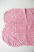デンマークで見つけた手編みのドイリーです。こちらは明るいピンクカラーのドイリーで、各コーナーが丸みを帯びて編まれておりほっこりとしたデザインです。とても凝ったデザインで、かなり編み物の上手な方の作品だと思います。