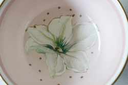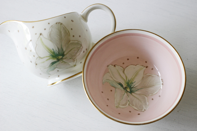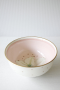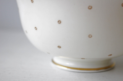 イギリス、スージークーパーのシュガーボウルです。1952年に発表されたアザレア(西洋つつじ)のシリーズです。内側はベビーピンク、白のアザレアが描かれ、縁周りには艶消しの金彩ととても上品な雰囲気です。アザレアの花言葉は、「満ち足りた愛」優雅な雰囲気でティータイムを楽しめそうです。
