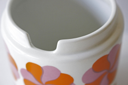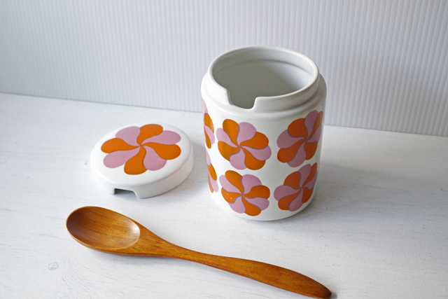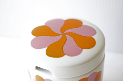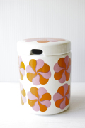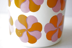 フィンランド、ARABIA社のヴィンテージポットです。ピンクとオレンジの風車のようなモチーフが並んだとてもレアなデザインになります。是非、キッチンで見せる収納としてお使いいただくきたいポットです。スティックのコーヒーや粉末出汁のもとなどを入れていただいて実用的にお使い下さいね。現地でもなかなか見かけない作品で、コレクションにもお勧めですお探しの方はお見逃しなく!