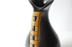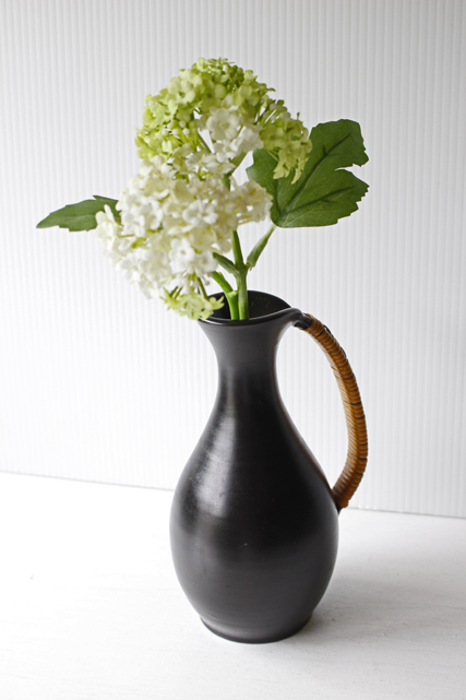 デンマーク製のヴィンテージベースです。こちらはブラックの美しいフォルムの花瓶に籐が丁寧に巻き付けられた持ち手があり、大変カッコいい雰囲気です。花瓶自体に存在感がありますのでオブジェとしても楽しめそうです。しっかりとした造りの素敵な花瓶でお勧めです!
