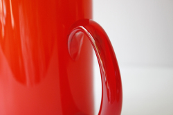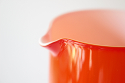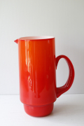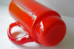 デンマーク、Holmegaardのヴィンテージガラスの持ち手付きジャグです。デザイナーは、MICHAEL BANGです。外側のガラスと内側のミルクガラスの2重構造になったPaletシリーズは、デンマーク国内でも評価が高くたくさんのコレクターがいます。本体は2重構造ですが、持ち手は赤のクリアガラスで透明感がありきれいです。ジャグとして食卓に、またすっきりとしたフォルムですので、花瓶としてお花を活けてもステキです。古さを感じさせない斬新な雰囲気はオブジェとして飾っていただいてもお部屋がパッと華やぐでしょう。お色も素敵とっても素敵です!