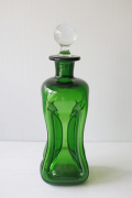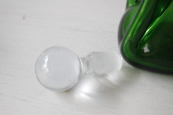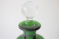 デンマークで見つけたHolmegaardのヴィンテージガラスのガラスボトルです。中央部分を細くして滑らかな曲線を表現し、真ん丸の蓋を配置してオブジェとして飾っておきたい技術性の高いアイテムです。美しいグリーンとキラキラと輝くクリアカラーが魅力です。