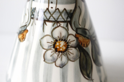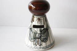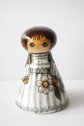 デンマークで見つけた貯金箱です。こちらはまあるい顔の愛らしい女の子がテント型のお洋服を着ているデザインです。頭の裏からコインを入れることが出来、底面は蓋が付いていますので、開け閉めが出来ます。子供部屋に飾りながらお小遣いなどを溜めるのにお勧めです。昔懐かしい少女漫画の世界に出てきそうな愛らしい表情と握ったフラワーモチーフがたまりませ~ん。