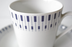 1936年~1969年という短い間しか存在しなかった、デンマークのLyngby Porcelain(リュンビュー・ポーセリン)のカップ&ソーサーです。こちらは1950年代に作られたタンジェント(鍵盤)シリーズで、ピアノの鍵盤がモチーフとなっています。清々しいホワイトとブルーの組み合わせが、清潔感があります。
