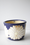 デンマークで見つけたヴィンテージの花瓶/鉢カバーです。こちらはネイビーブルーの地に凹凸のあるレトロなフラワーモチーフがデザインされています。美しいネイビーブルーが植物をより美しく飾ってくれそうです。
