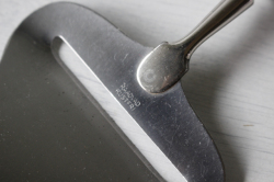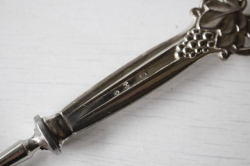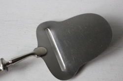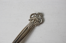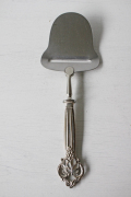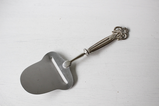 デンマーク製、ヴィンテージのチーズスライサーです。こちらは大きな葡萄のモチーフが可愛らしくデザインされており、表だけでなく裏面から見ても立体感があり、大変凝った作りです。スターリングシルバーの刻印が裏面にはあり、純銀製の贅沢なチーズスライサーになります。先端のスライサー部分はステンレス製になっており実用的です。大切に使いながら食卓などで、大変エレガントなテーブルコーディネイトが演出できそうな一生モノのカトラリーです。