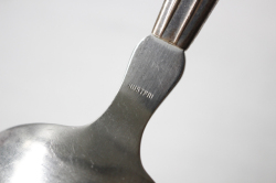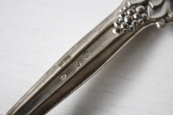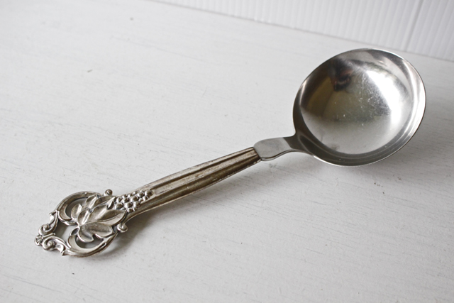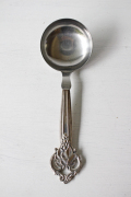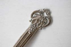 デンマーク製、ヴィンテージのスプーンです。こちらは大きな葡萄のモチーフが可愛らしくデザインされており、表だけでなく裏面から見ても立体感があり、大変凝った作りです。真ん丸の大きめサイズのスプーンですので、お料理やデザートなど取り分け料理に添えて重宝しそうです。スターリングシルバーの刻印が裏面にはあり、純銀製の贅沢なスプーンです。先端のすくう部分はステンレスになっており実用的です。大切に使いながら食卓などで、大変エレガントなテーブルコーディネイトが演出できそうな一生モノのカトラリーです。