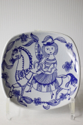 1960年代にFiggoと合併したノルウェーのStavangerflint(スタヴァンゲルフフリント)社の絵皿です。デザインは、’55~’77まで同社で活躍したKari Nyquistです。着飾った白馬にドレスを着たはつらつとした女性が横座りをして何かサーカスのパフォーマンスのような愉快なモチーフがデザインされています。飾っても可愛らしいですし、お菓子などを盛りつけてティータイムにお出ししてもよいでしょう。