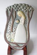 スウェーデン、Upsala Ekebyで1969~1971年までフリーランスのアーティストとして在籍していたIrmaYourstoneの陶板の壁掛けです。デザイナーIrmaYourstone(1911~1988年)の工房から販売されたものです。少女が森の中で祈りをささげているような優しい雰囲気です。マットな釉薬とパステルカラーの淡い色合いが作品の雰囲気ととてもよく合っています。壁に飾れるようにフックがついています。市場にはほとんど出回らない作品ですので、お見逃しなく!