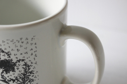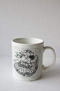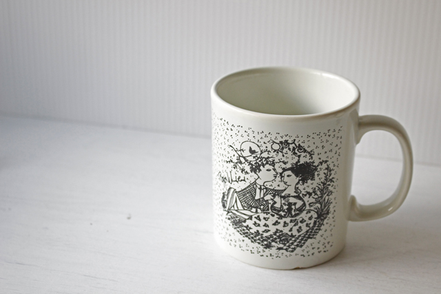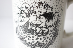 デンマークの人気デザイナーBjorn Wiinblad(ヴョルン・ウィンブラッド)のマンスリーマグカップです。こちらのシリーズは1月から12月までの1枚1枚に男女の出会い、結婚、妊娠、出産までを四季を交えながら描いています。5月のテーマは「HARMONI」。仲睦まじい2人が野原で手を取り合い愛を語り合っているのでしょうか?2人の甘い雰囲気が伝わってきそうですね。