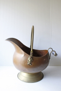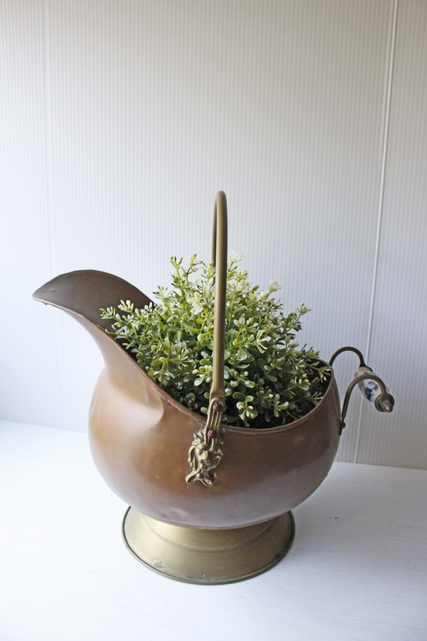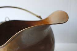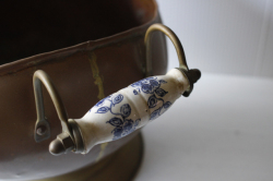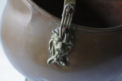 デンマークで見つけた真鍮の大きな入れ物です。こちらは多分、オーブンの横に石炭などを入れて使われていたかと思われます。注ぎ口のようなフォルム&持ち手もしっかりとしており、実用的に石炭を暖炉に入れたりするに使い勝手よくデザインされていたかと思われます。持ち手の部分には陶器が着けられています。お気に入りの小物や鉢カバーとしても楽しめそうですし、真鍮ならではのオブジェとして飾って頂いても、落ち着いたアンティークのインテリアを演出できそうです。