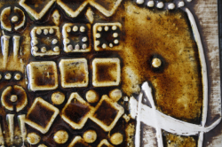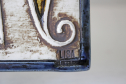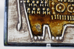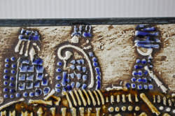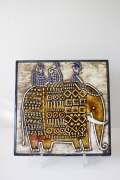 スウェーデン、リサ・ラーソンデザインの陶板の壁掛けです。ゾウさんの背中に高貴な人が乗って進んでいます。中央はマットな釉薬がかけられ背景はツヤのある釉薬がたっぷりとかけられています。こちらは飾りやすい大きさと厚みで場所を選ばず飾っていただけそうです。