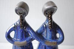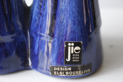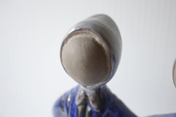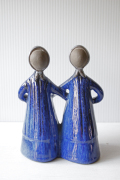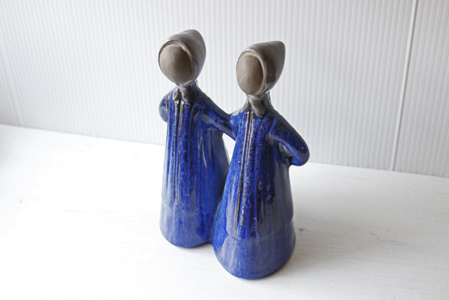 スウェーデンのjie gantofta社製の陶器のオブジェです。こちらは丸い顔で素朴な双子の女の子が後ろで手をクロスに繋いでいる様子が表現されています。顔に表情が描かれていなく、後ろ向きの姿に手が掛かっており、個性的な作品です。編み込みのヘアスタイルや赤ずきんちゃんのように頭に巻いたスカーフも素朴で微笑ましいですね。コバルトブルーのドレスも清々しくて素敵です。Jie社のオブジェはは当店でも人気のアイテムですのでお探しの方はお見逃しなく!