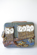 スウェーデン、EGO社の陶板の壁掛けです。愛嬌のある表情のフクロウが3羽、森の木にとまっている様子がデザインされています。画面から飛び出したように立体的に作られています。EGO社の作品は市場でも少なく希少になっております。お探しの方はお見逃しなく。