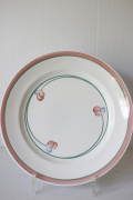 スウェーデン、Rorstrand(ロールストランド)、JENNYシリーズのディナープレートです。丸みのあるフォルムにハンドペイントでピンクやミントグリーンのお花やラインが絵付けされています。パステルカラーの優しい雰囲気が曲線の美しいフォルムともよく合っています。ハンドペイントならではの個々の異なるタッチや線描の細さ、刷毛目の美しさなどお楽しみいただけます。朝食のプレートに、夕食のメイン料理に多様にお使いいただけます。