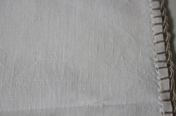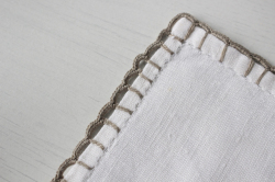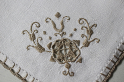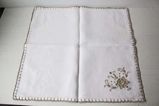 デンマークで見つけた手刺繍の正方形のクロスです。麻地に、糸を抜いてレース模様に刺繍、そして縁周りにも繊細なかぎ針編みで飾られています。丁寧で手間のかかった作品です。ホワイト×グレーベージュの上品な雰囲気で、ヴィンテージの手仕事が楽しめるでしょう。