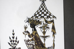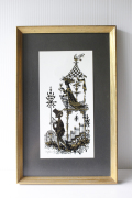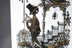 デンマークの人気デザイナーBjorn Wiinblad(ヴョルン・ウィンブラッド)の美しい影絵(イラスト)です。ヴョルンといえば絵皿が有名ですが、イラストレーターとしての作品も素晴らしいのです。こちらはベランダに佇むカップルが描かれており、男性がハープを奏でています。2人で楽しそう歌を歌っている微笑ましいデザインです。影絵に金彩で表情がつけられています。